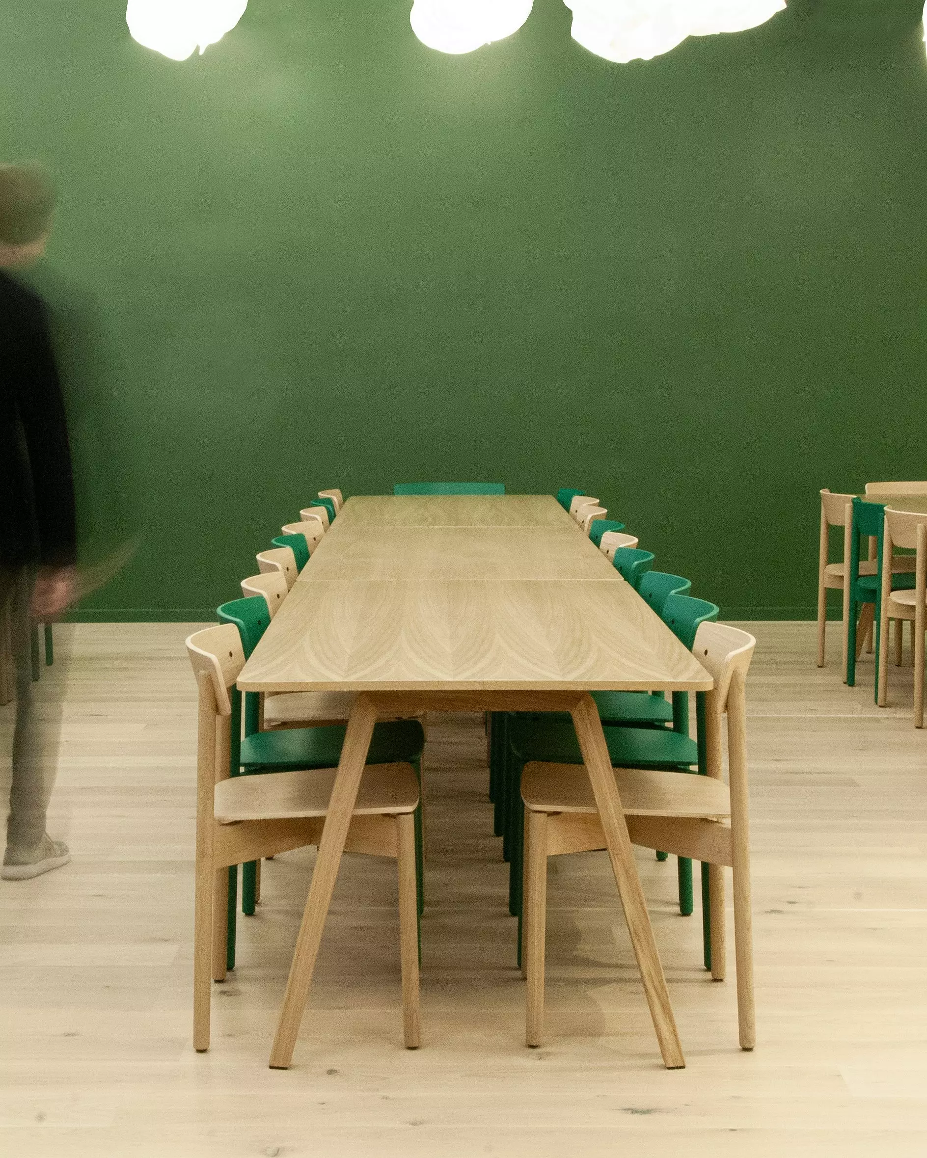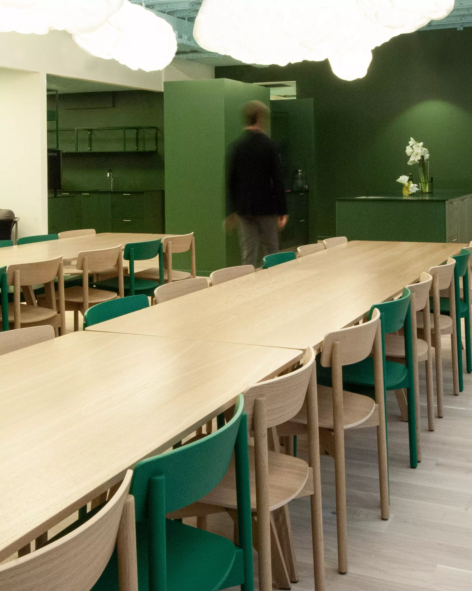 Tradeshift is a cloud based business network and platform for supply chain payments, marketplaces, and apps. In the Danish office in Copenhagen city centre, you find a mix of Cross Chairs in oak oil and custom made company green.