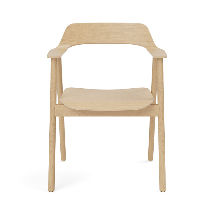Made entirely of oak, the Bow Chair is comfortable, visually pleasing and brimming with character. The moulded plywood seat is unusually wide in proportion to its depth and a waterfall edge at the front softens contact with the hamstrings.