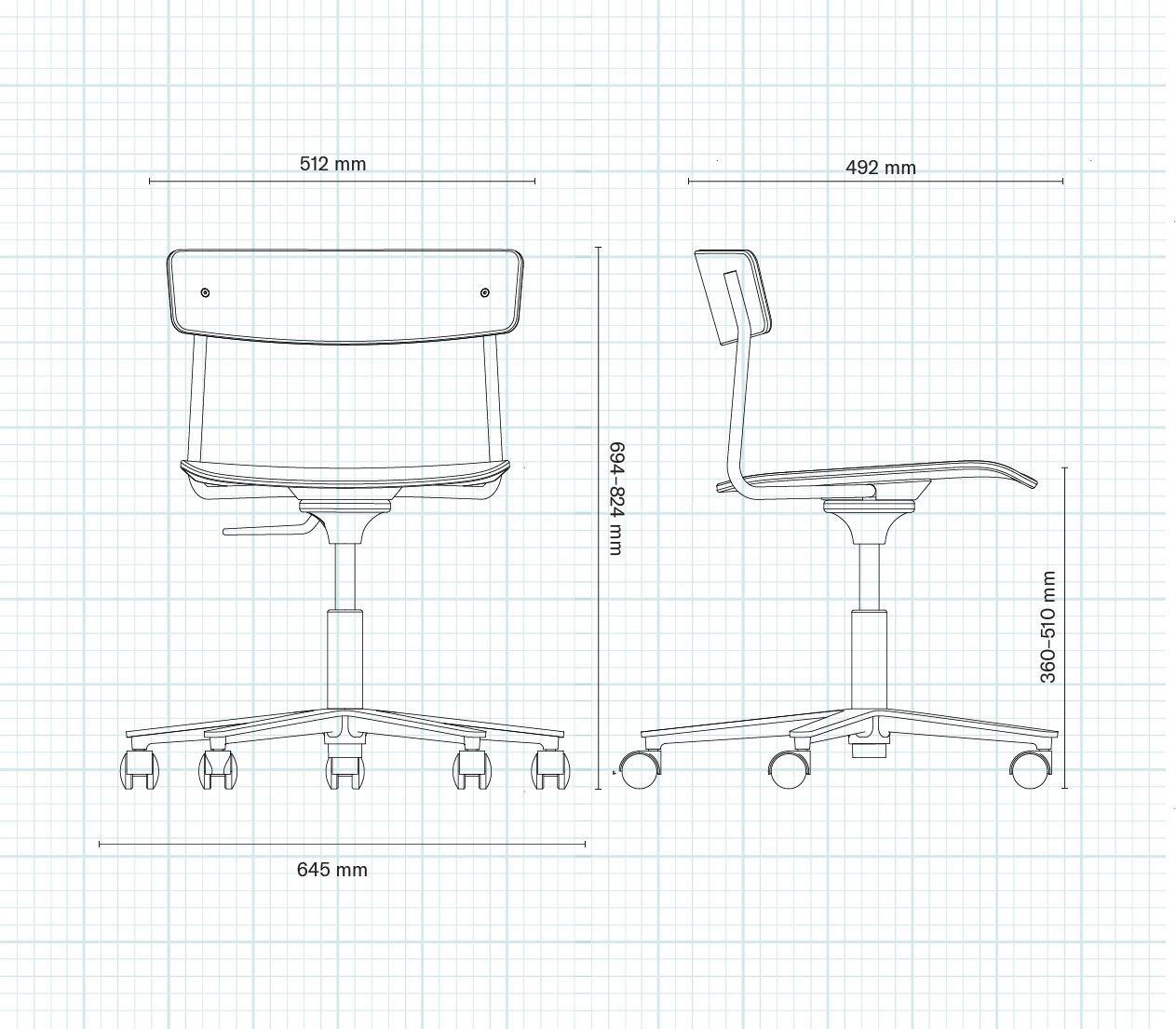 With minimal knobs and levers, the chair has a swivel base and pneumatic lift with a height-adjustable lever. It has a simple, intuitive range of dynamic movement, allowing the user to lean backwards and forwards, relieving tension and creating postural change. A gently curved lip in the front edge of the seat reduces pressure on the backside of the leg. The armrest version offers enhanced support and comfort.